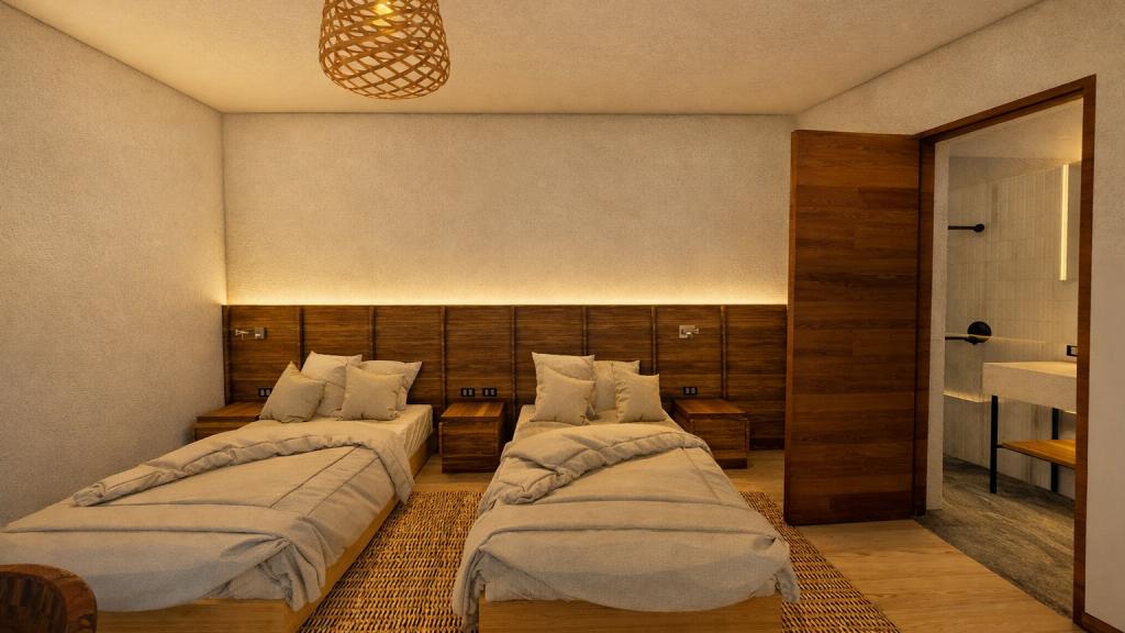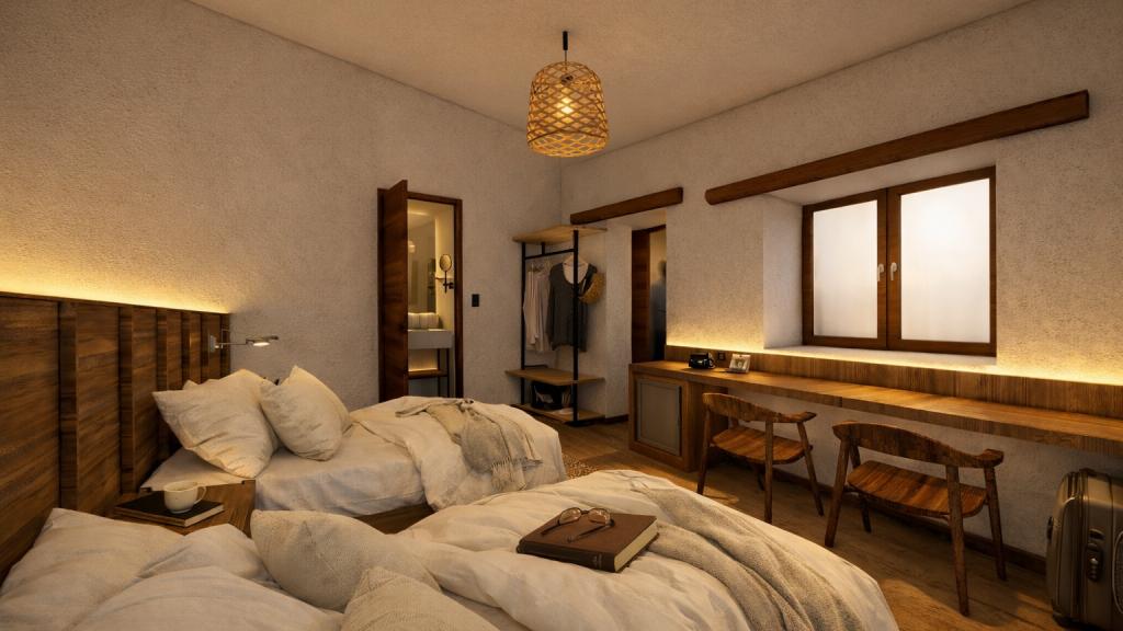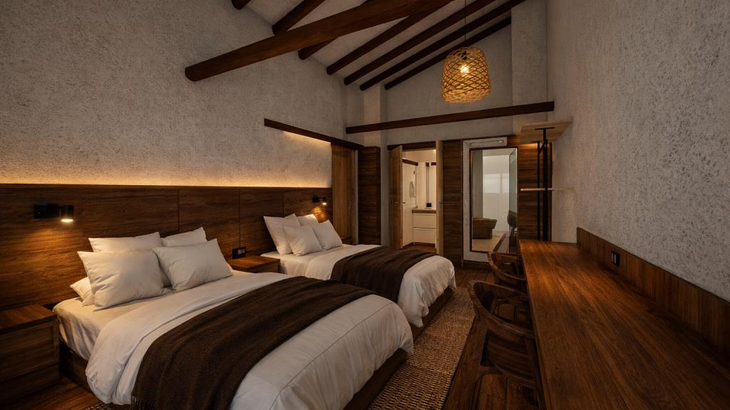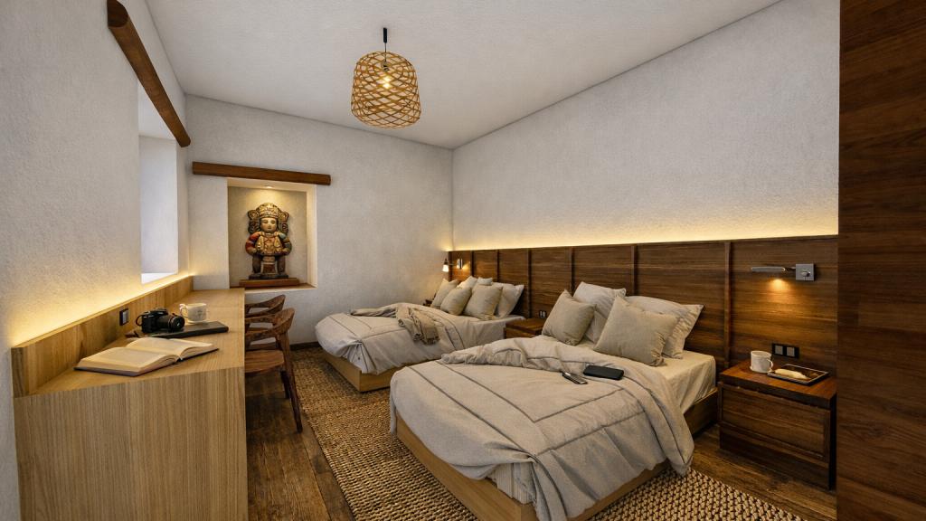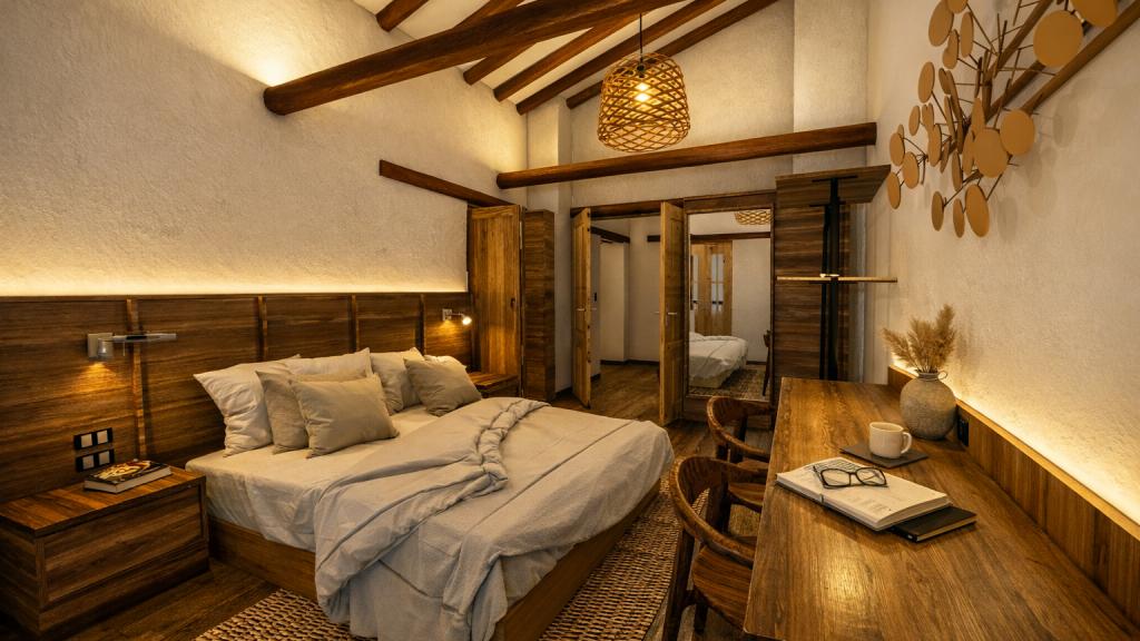 Os quartos estão decorados com tecidos naturais, tapeçarias e detalhes de decoração regional. Alguns quartos têm uma varanda privada e uma área de estar com mobiliário de design elaborado e pilares rústicos.